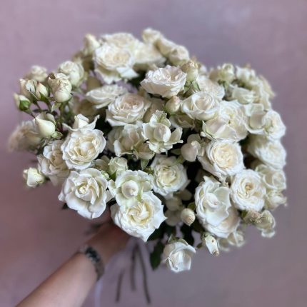 Букет из белой эустомы и кустовой пионовидной розы в дизайнерской упаковке “Бомбастик”