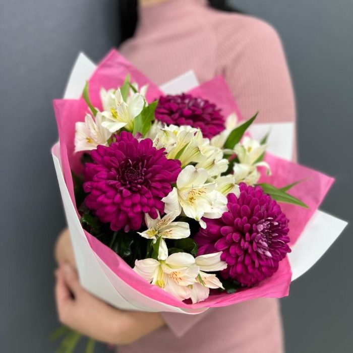 ламира – 3 шт.Альстромерия – 4 шт.Тишью – 2 шт.Пленка матовая – 2 шт.Лента атласная – 2 шт.