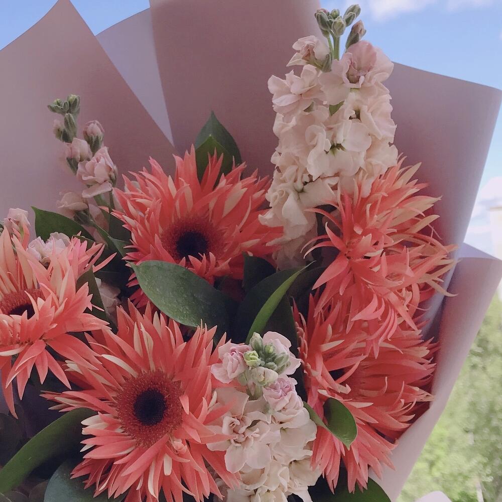 Махровые герберы, маттиола, эвкалипт