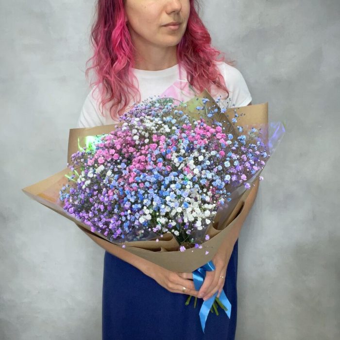 Оригинальный букетик яркой гипсофилы подарит отличное настроение на весь день! И даже дольше, ведь букетик очень стойкий и будет радовать не один день.