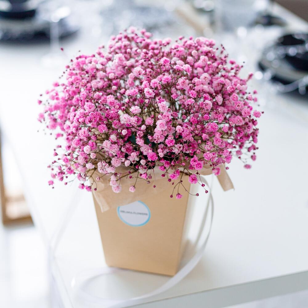 гипсофила цветная – 5 шт.Губка флористическая – 1 шт.Лента атласная – 2 шт.Сумочка картонная – 1 шт.