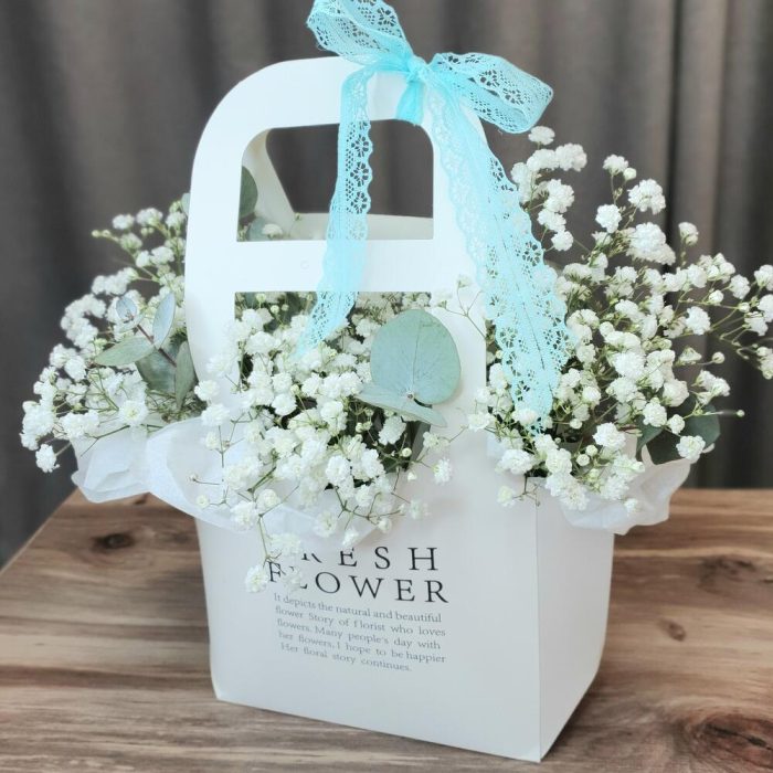 Лента Кружево – 1 шт.Эвкалипт пучок – 1 шт.Оазис флористический – 1 шт.сумочка декоративная – 1 шт.Гипсофила – 4 шт.