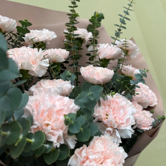Эвкалипт Baby Blue – 10 шт.Лента атласная кремовая – 1 шт.Упаковка корейская пленка – 1 шт.диантус кремого-розовый – 19 шт.