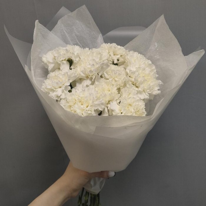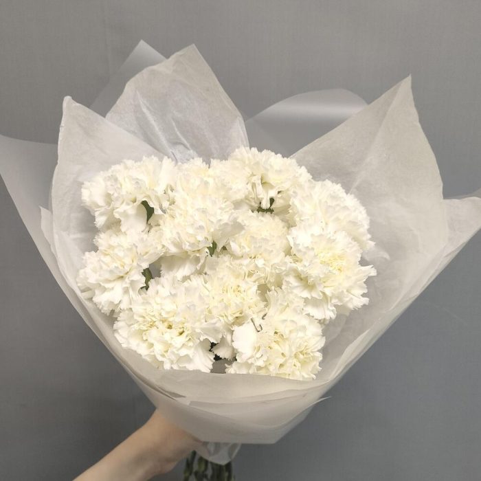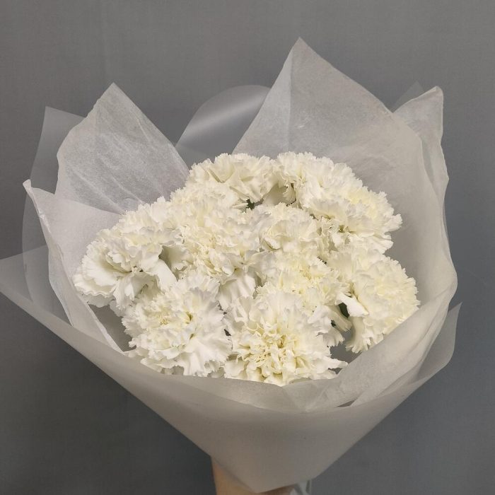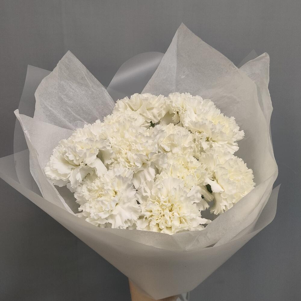 Гвоздика белая – 11 шт.Тишью – 1 шт.Пленка матовая – 1 шт.