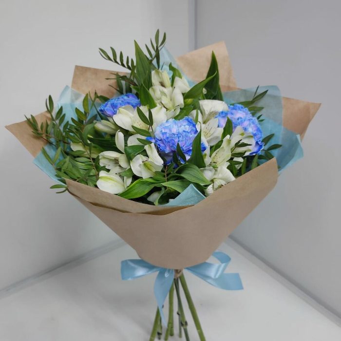 Альстромерия – 4 шт.Дизайнерская упаковка – 1 шт.зелень фисташки – 1 шт.диантусы голубые – 3 шт.