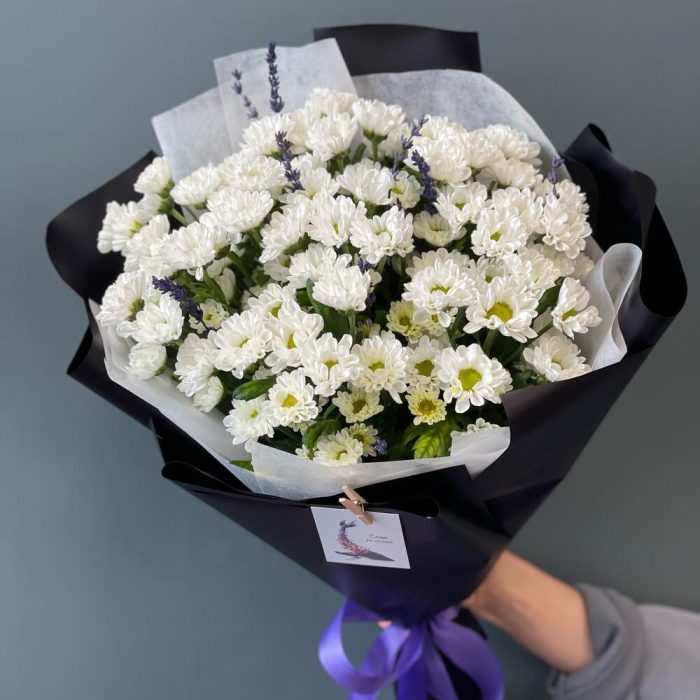 Лаванда – 10 шт.Лента – 1 шт.Хризантема Сантини – 9 шт.Упаковка дизайнерская – 1 шт.Открыточка с вашими пожеланиями – 1 шт.