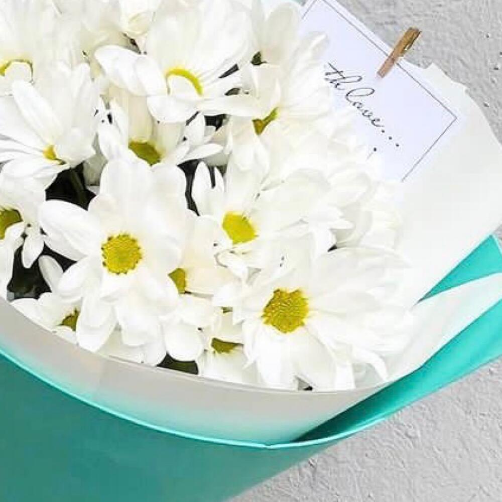 Хризантема кустовая – 3 шт.Лента атласная – 1 шт.Открытка – 1 шт.Упаковка дизайнерская – 3 шт.