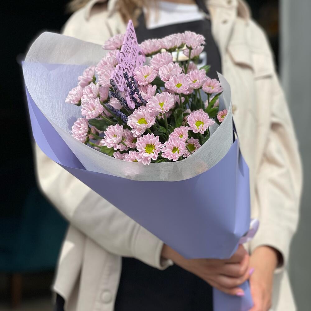 Хризантема Сантини – 5 шт.Лаванда (сухоцвет) – 7 шт.Упаковка – 1 шт.Лента – 1 шт.Открытка мини – 1 шт.Топпер деревянный – 1 шт.