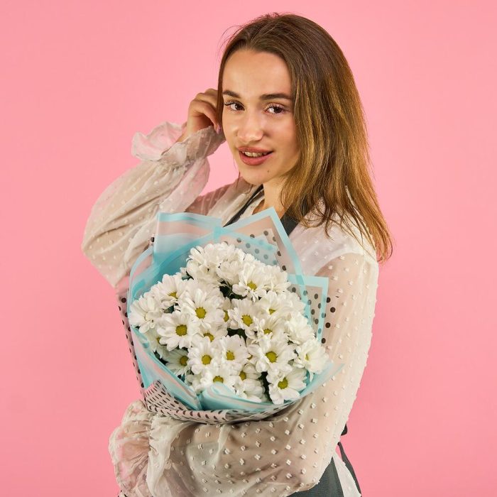 хризантема кустовая (белый) – 11 шт.пленка цветная – 1 шт.лента атласная (синий) – 1 шт.