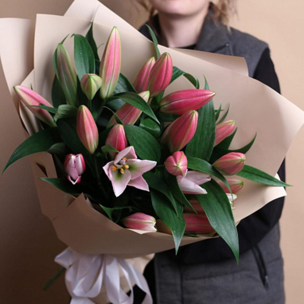 лилия ориентильная розовая – 7 шт.Корейская пленка – 2 шт.Атласная лента – 1 шт.