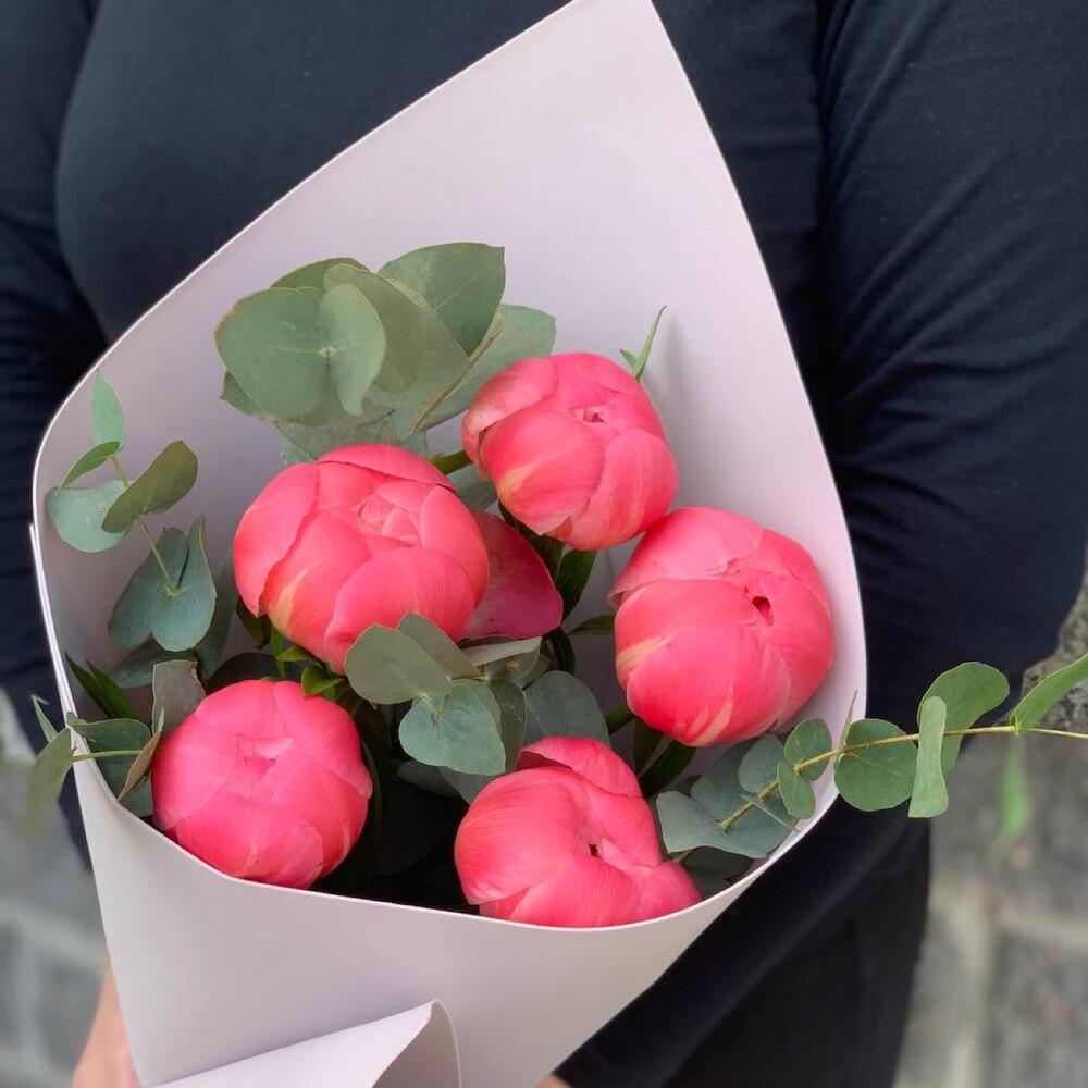 Пион коралл шарм – 5 шт.Эвкалипт – 1 шт.Упаковка дизайнерская – 1 шт.Лента атласная – 1 шт.