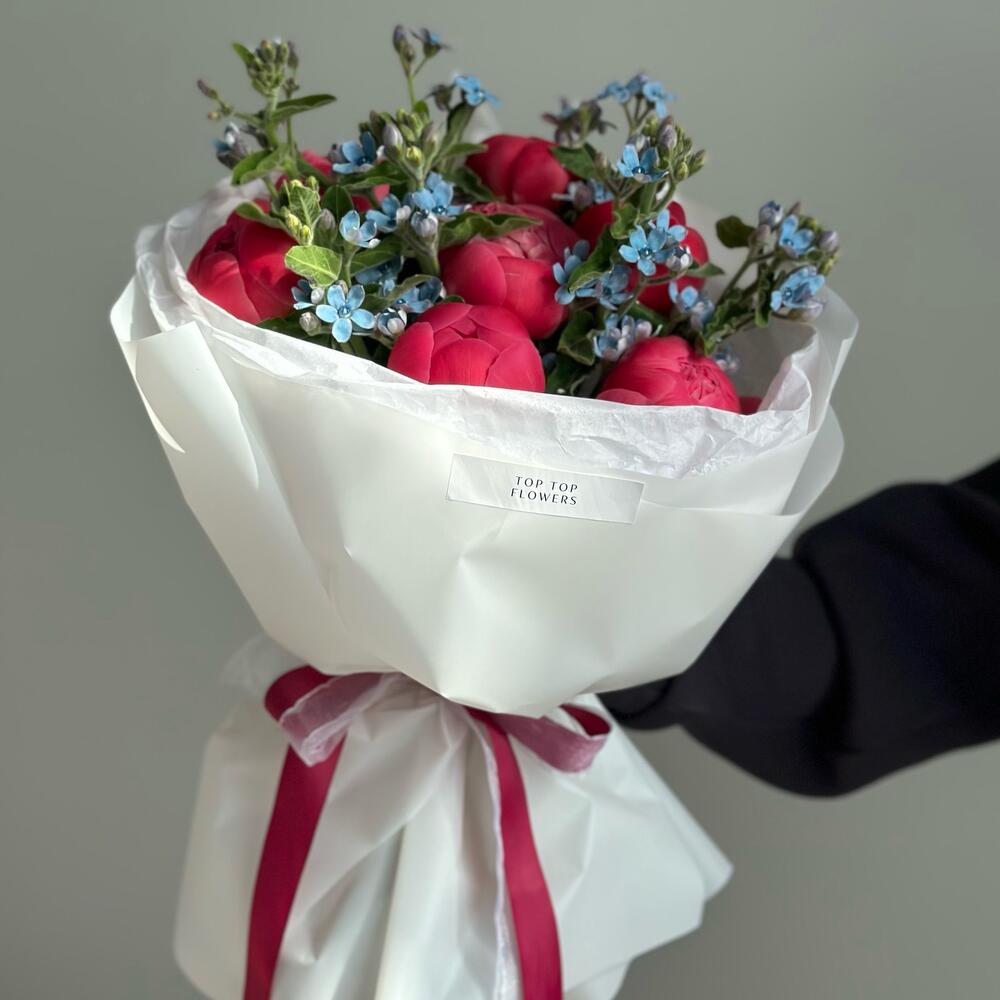 Пион – 7 шт.Оксипеталум – 6 шт.Упаковка дизайнерская – 1 шт.Средство продления жизни цветка – 1 шт.любовь флориста (бесплатно) – 100500 шт.