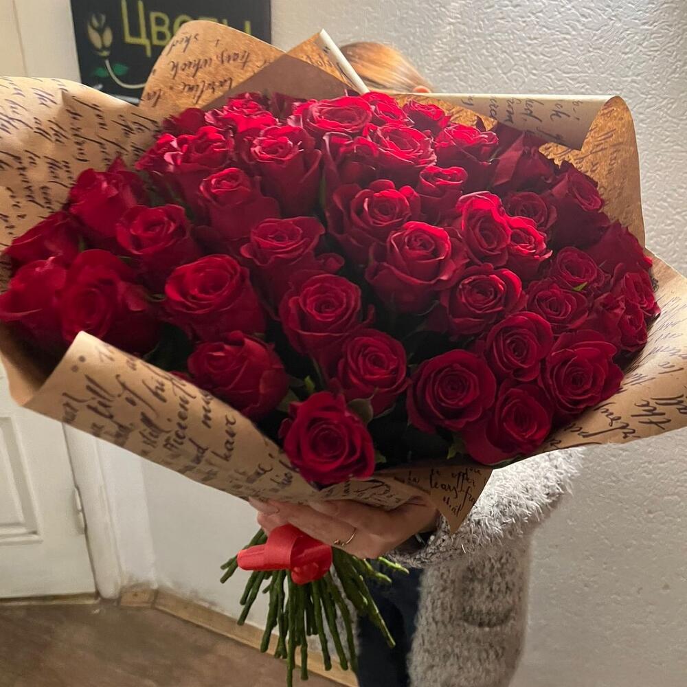 розы эквадор (60 см) – 51 шт.Лента атласная – 1 шт.Упаковка дизайнерская – 2 шт.