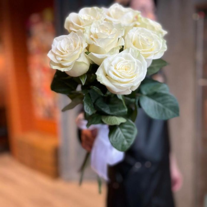 белые розы эквадор 50 см – 7 шт.Лента атласная – 2 шт.