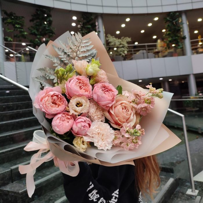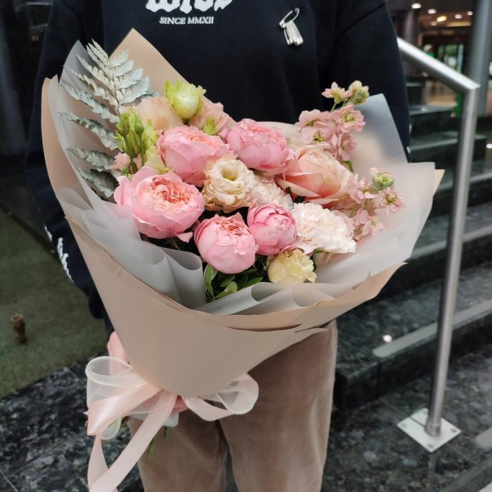 Ахматова Персиковый букет с пионовидной розой матиолой и папоротником