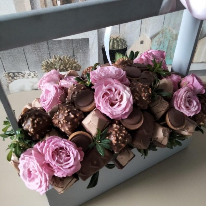 Роза кустовая – 1 шт.Шоколадные конфеты – 300 гр.Тоффифи – 15 шт.Сникерс мини – 10 шт.натуральная зелень – 1 шт.Ящик деревянный – 1 шт.