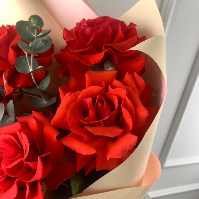 Роза Эквадор – 5 шт.Эвкалипт – 1 шт.Пленка матовая – 1 шт.Лента – 1 шт.