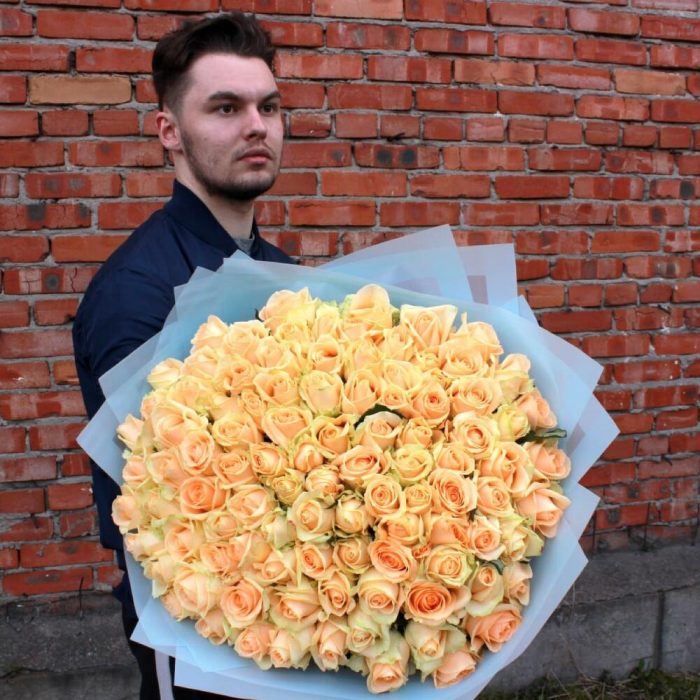 роза пич аваланж – 101 шт.упаковочный материал – 3 шт.Лента атласная – 1 шт.