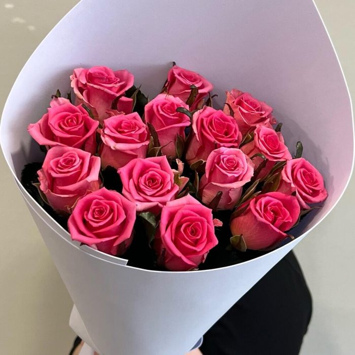 Букет из 15 розовых роз в упаковке