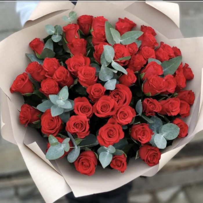Букет из 51 красной розы с эвкалиптом