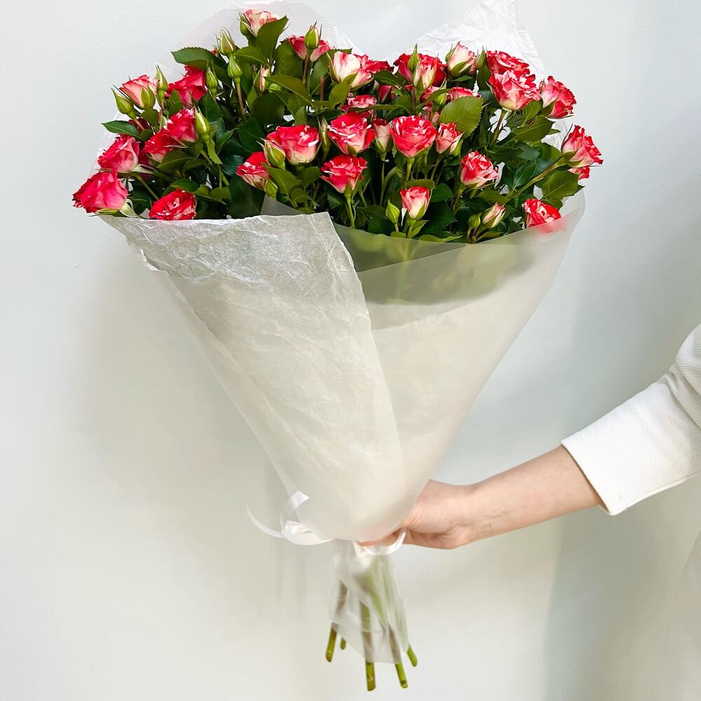 Кустовая роза – 5 шт.Лента атласная – 1 шт.Тишью – 2 шт.Матовая пленка – 2 шт.