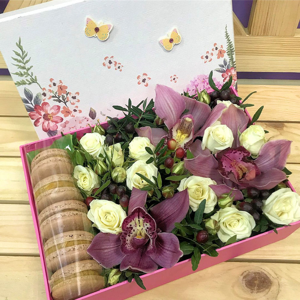 Букет из орхидеи, кустовых роз и макаронс в декоративной коробке “Лучи заката”