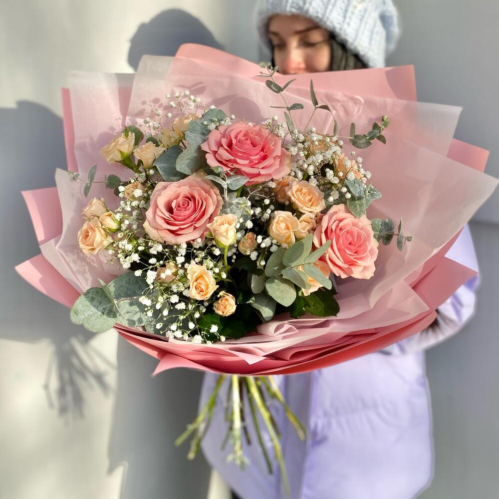 Гипсофила – 3 шт.Роза кустовая – 5 шт.Эвкалипт – 3 шт.Лента атласная – 2 шт.Тишью – 2 шт.Роза пионовидная – 3 шт.Упаковка дизайнерская – 3 шт.