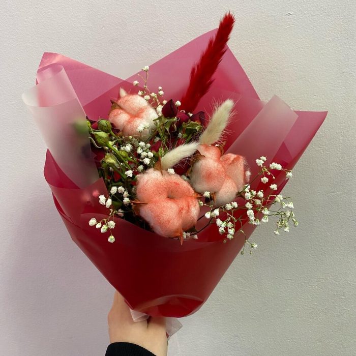Хлопок – 3 шт.Роза кустовая – 2 шт.Помпасная трава – 1 шт.Гипсофила – 1 шт.Дизайнерская упаковка – 1 шт.открытка с вашими пожеланиями – 1 шт.