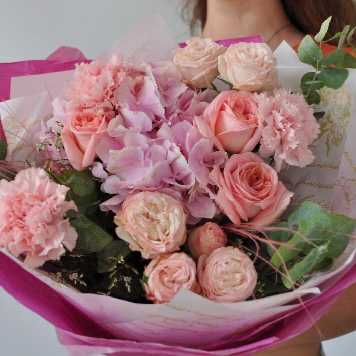 Гортензия – 1 шт.Лимониум – 1 шт.Эвкалипт – 1 шт.Гвоздика – 3 шт.Лента атласная – 1 шт.Роза пионовидная – 3 шт.Кустовая пионовидная роза – 2 шт.Крафт упаковка – 2 шт.Ковыль – 3 шт.Крафт жатый – 2 шт.