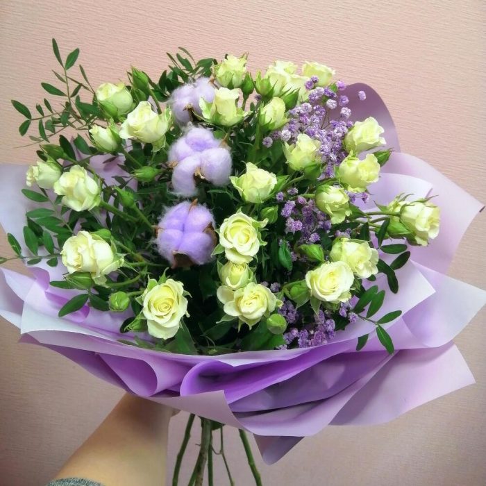 Роза кустовая – 5 шт.Гипсофила – 1 шт.Хлопок натуральный – 3 шт.Фисташка – 2 шт.Упаковка – 1 шт.
