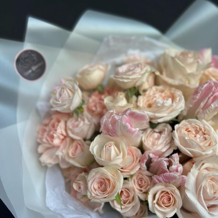 Диантус – 3 шт.Кустовая роза – 5 шт.Одноголовая роза – 3 шт.тюльпаны – 5 шт.декоративная упаковка – 1 шт.Атласная лента – 1 шт.