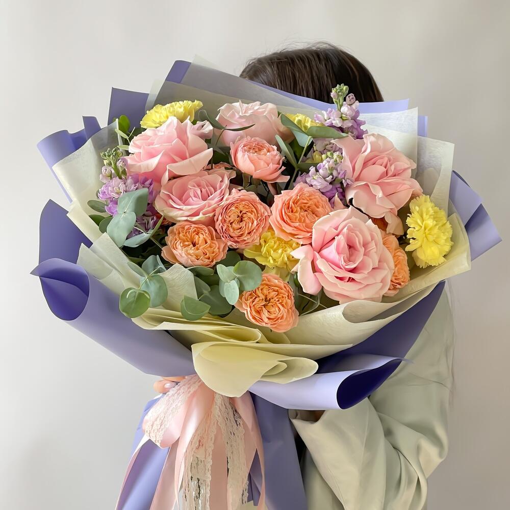 Лента – 2 шт.Маттиола – 3 шт.Эвкалипт – 2 шт.Роза одноголовая – 5 шт.Гвоздика – 5 шт.Упаковка дизайнерская – 2 шт.Кризал (подкормка) – 2 шт.Открытка мини – 1 шт.Роза кустовая джульетта – 3 шт.