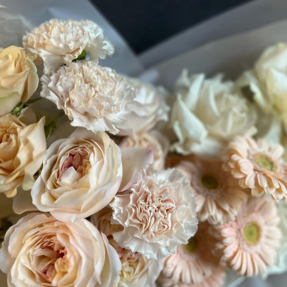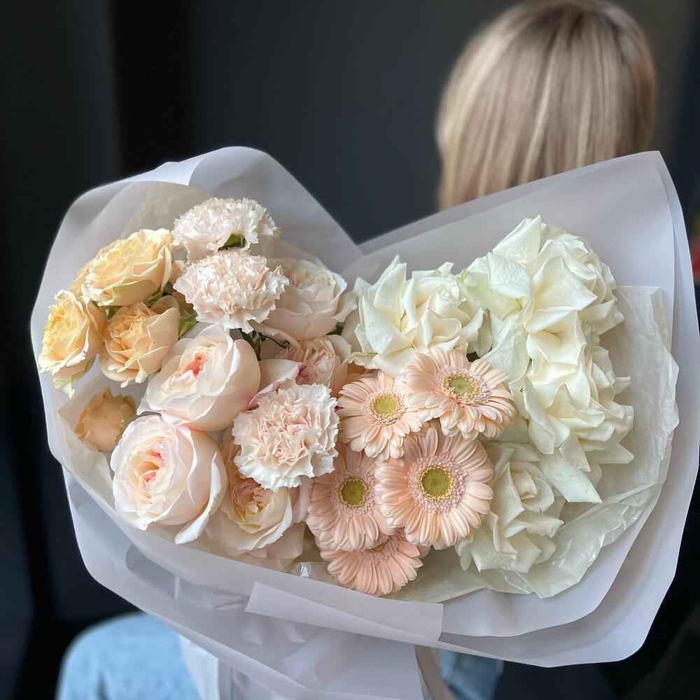 Одноголовая роза – 4 шт.Гербера – 5 шт.Диантус – 3 шт.Пионовидная роза – 5 шт.Кустовая роза – 1 шт.декоративная упаковка – 1 шт.Атласная лента – 1 шт.