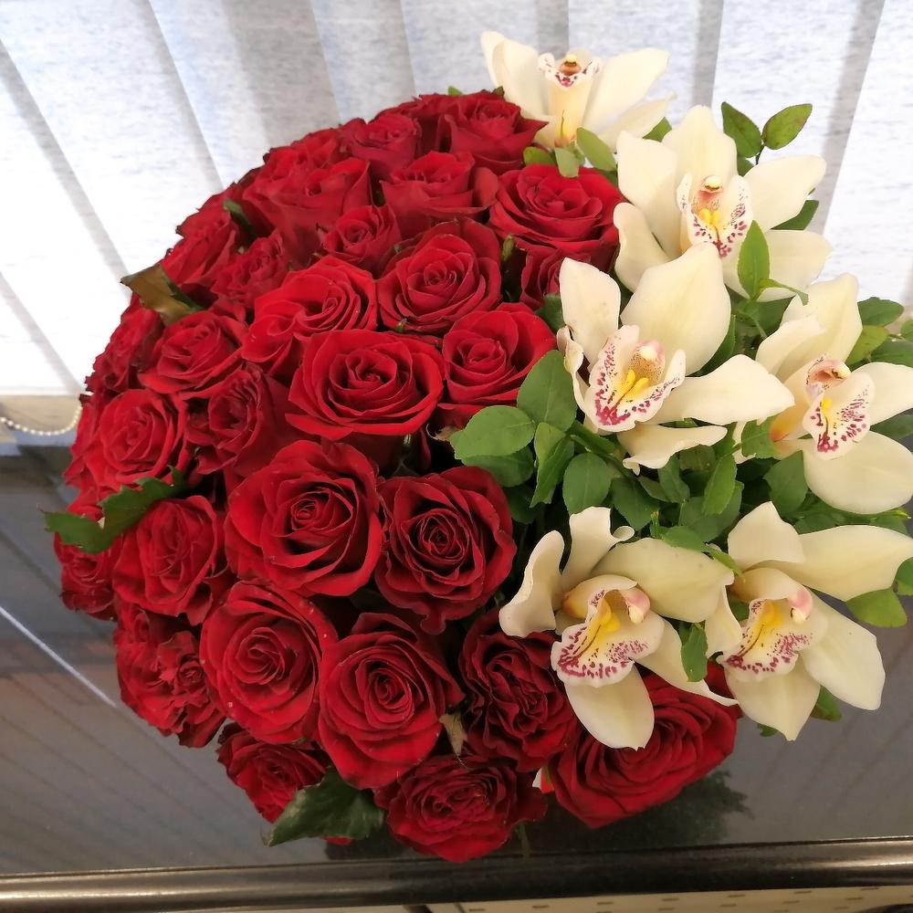 Орхидея Цимбидиум – 6 шт.Роза красная – 39 шт.Оазис флористический – 1 шт.Коробка шляпная – 1 шт.