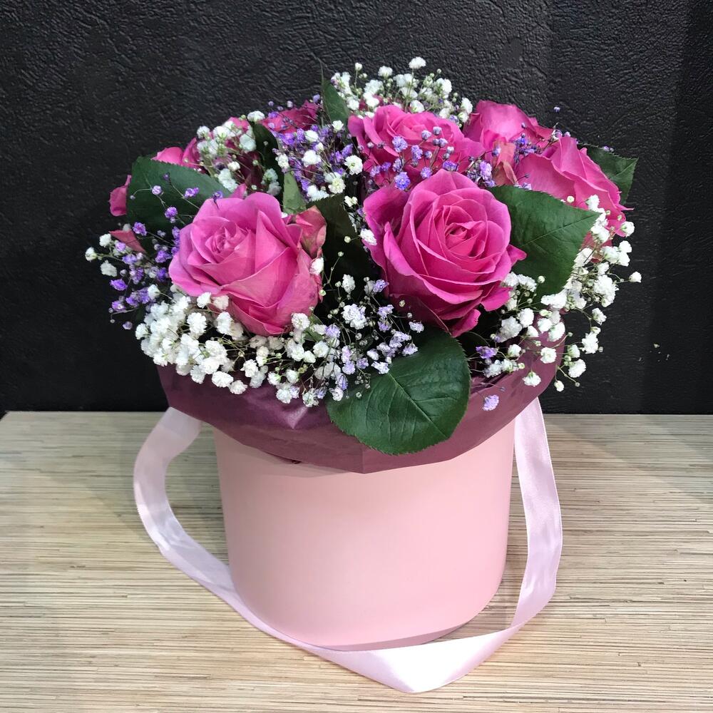 Роза 50 см – 9 шт.Гипсофила – 2 шт.Тишью – 1 шт.Коробка шляпная – 1 шт.