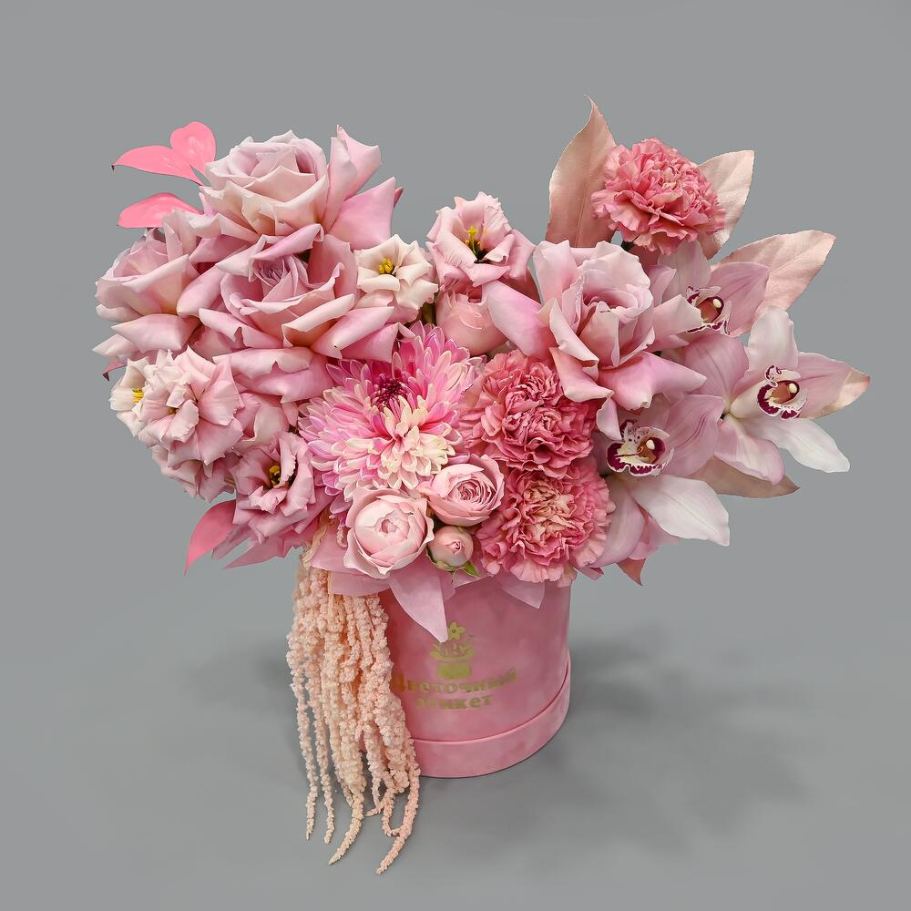 Французская роза – 5 шт.Орхидея Цимбидиум – 3 шт.Хризантема – 1 шт.Эустома – 4 шт.Гвоздика – 5 шт.Пионовидная кустовая роза – 4 шт.Аралия – 1 шт.Амарант – 1 шт.Рускус – 3 шт.