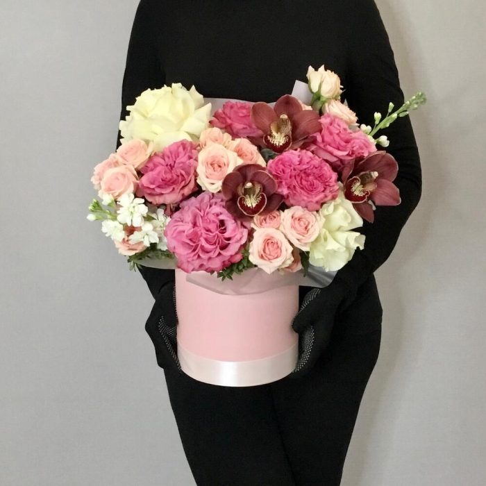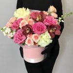 Маттиола – 2 шт.Кустовая роза – 4 шт.Зелень – 3 шт.Лента атласная – 1 шт.ЦИМБИДИУМ – 3 шт.Французская роза – 2 шт.Пленка матовая – 1 шт.Оазис флористический – 2 шт.пионовидная роза кантри блю – 5 шт.шляпная коробка 18 см – 1 шт.