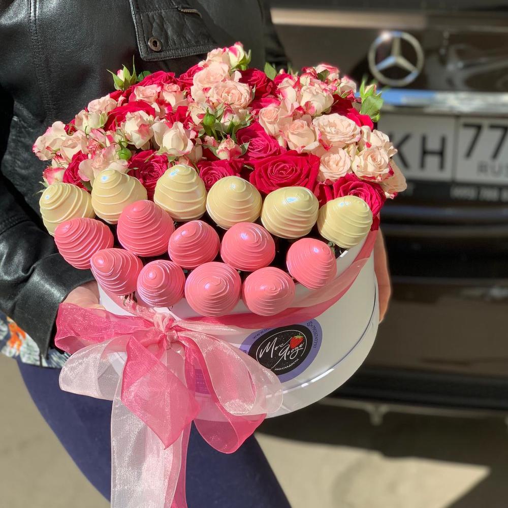 Клубника в шоколаде callebaut (бельгия) – 15 шт.Кустовая роза – 10 шт.Пионовидная кустовая роза – 10 шт.