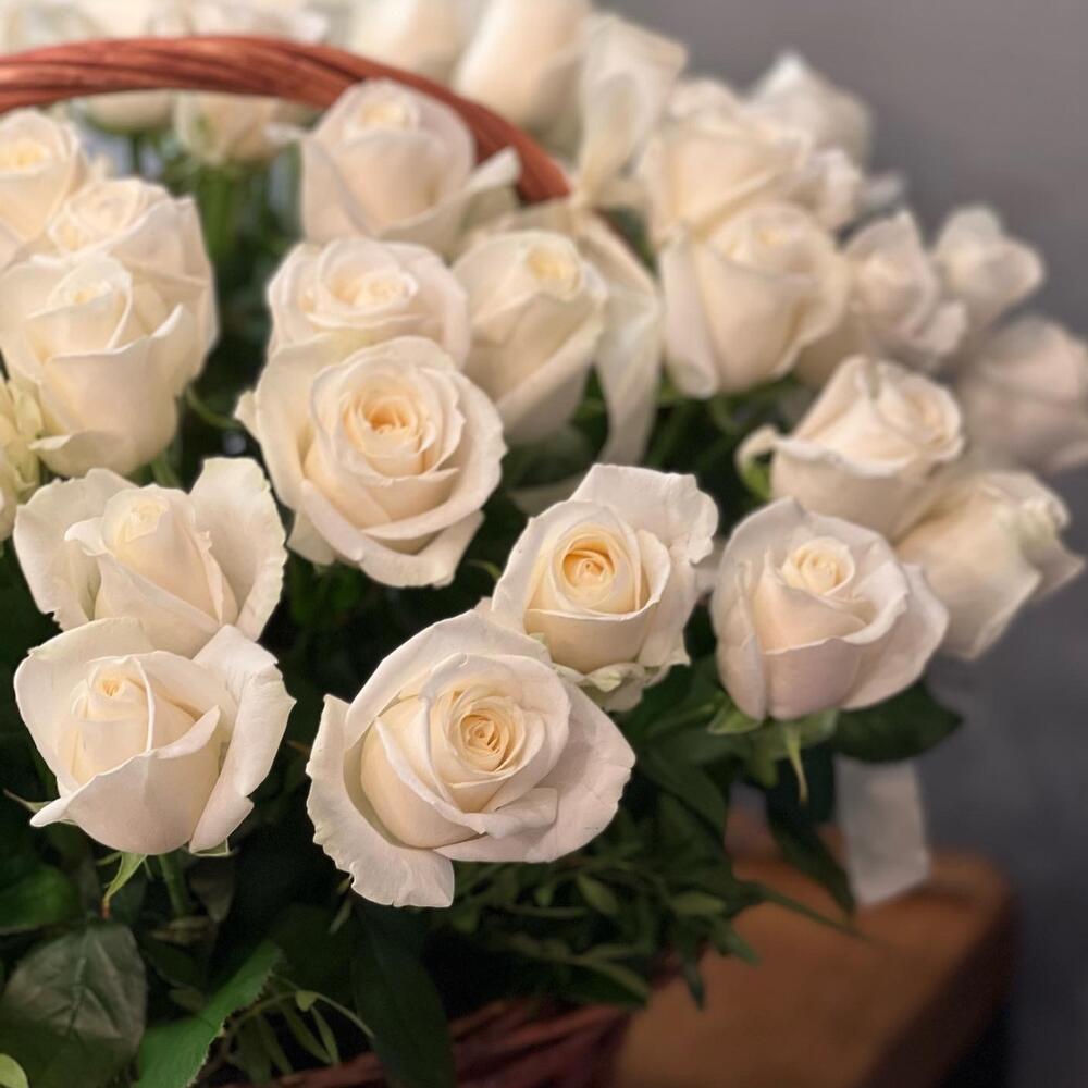 белые розы – 39 шт.Корзина плетеная – 1 шт.Оазис флористический – 2 шт.Пленка матовая – 1 шт.работа флориста – 1 шт.пленка транспортировочная – 1 шт.