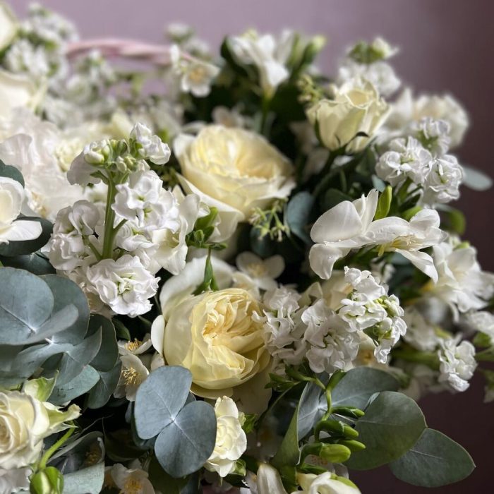 Роза – 21 шт.Пион – 1 шт.Роза пионовидная – 7 шт.Фрезия – 28 шт.Маттиола – 35 шт.Гвоздика – 15 шт.Эвкалипт – 13 шт.Корзина плетеная – 1 шт.Флористическая губка – 3 шт.