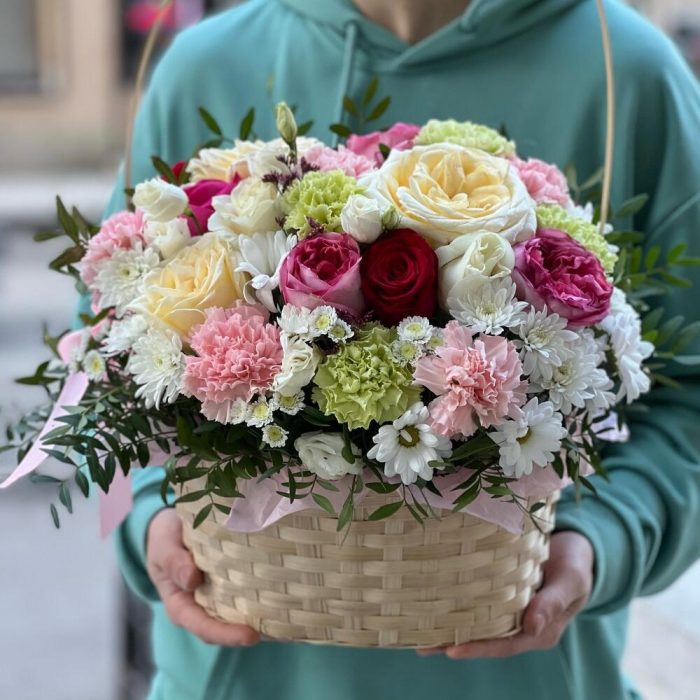 роза пионовидная канделайт – 3 шт.роза пионовидная пинк экспрешн – 4 шт.Роза красная – 2 шт.Роза Pink Floyd – 1 шт.Роза белая мондиаль – 2 шт.лизиантус белый эустома – 2 шт.диантус розовый и зеленый – 9 шт.хризантема кустовая пучок – 3 шт.Фисташка пучок – 5 шт.сталион белый пучок – 3 шт.Оазис флористический – 1 шт.Корзина плетеная – 1 шт.Тишью – 1 шт.