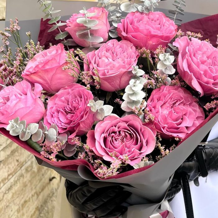 Лента атласная – 2 шт.Тишью – 2 шт.Лимониум розовый – 3 шт.Упаковка корейская пленка – 1 шт.роза премиум queens krown – 9 шт.