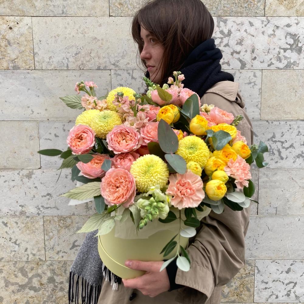 Роза пионовидная кустовая – 7 шт.Хризантема – 5 шт.Маттиола – 7 шт.Львиный зев – 3 шт.Эвкалипт – 7 шт.Ветки малины – 3 шт.Тишью – 2 шт.Шляпная коробка – 1 шт.Оазис флористический – 1 шт.
