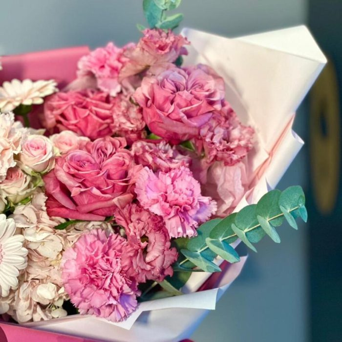 Роза кустовая – 2 шт.Роза одноголовая – 3 шт.Гербера мини – 2 шт.Гвоздика – 5 шт.Лизиантус – 1 шт.Эвкалипт – 1 шт.Гортензия – 1 шт.Упаковка дизайнерская – 1 шт.Лента атласная – 1 шт.