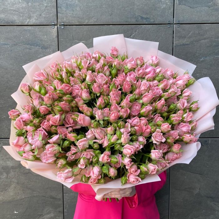 Роза кустовая – 27 шт.Лента атласная – 1 шт.Упаковка дизайнерская – 7 шт.