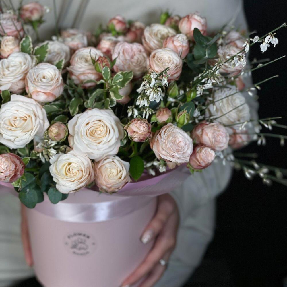 Кустовая роза Бомбастик – 11 шт.эвкалипт синерея – 2 шт.Питтоспорум нигра – 2 шт.Гениста – 2 шт.Шляпная коробка – 1 шт.