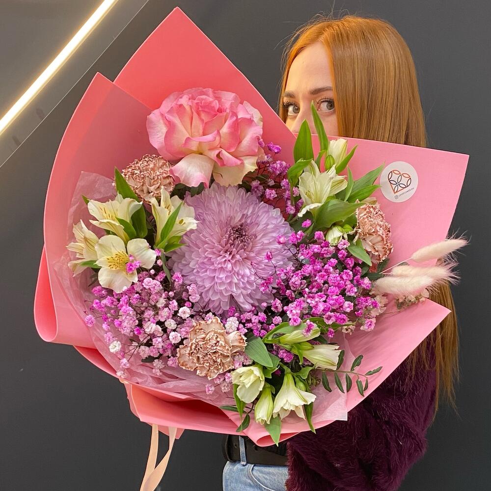 Альстромерия – 5 шт.Гипсофила – 3 шт.Хризантема – 1 шт.Роза Эквадор – 1 шт.Гвоздика – 3 шт.