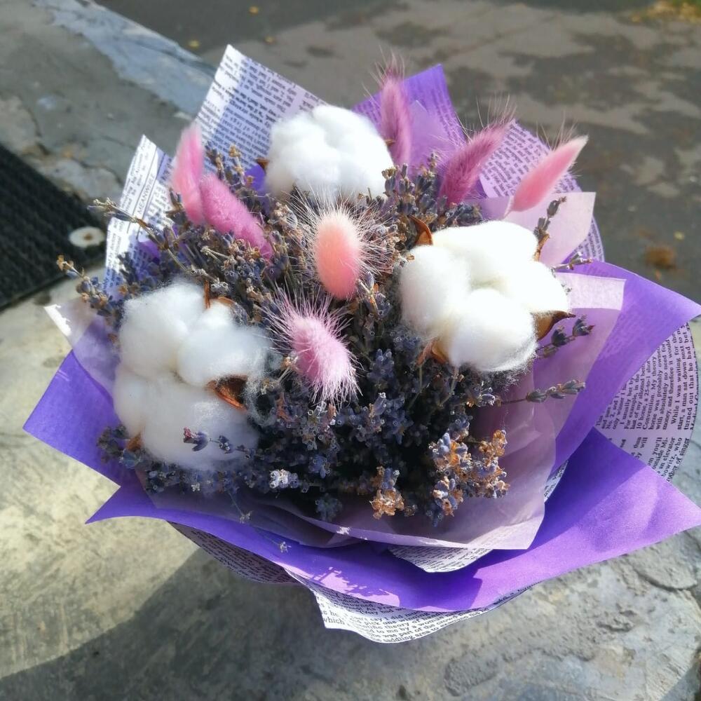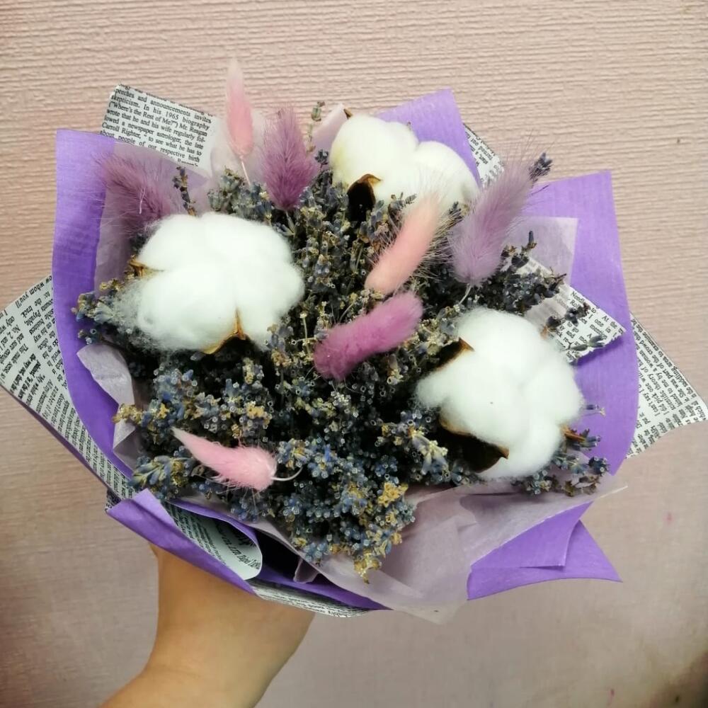 Лаванда (сухоцвет) – 50 шт.Лента – 1 шт.Упаковка – 1 шт.Лагурус – 7 шт.Хлопок натуральный – 3 шт.