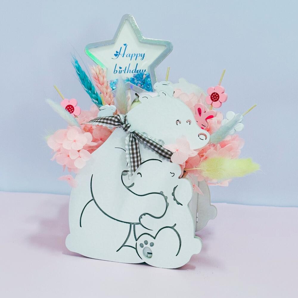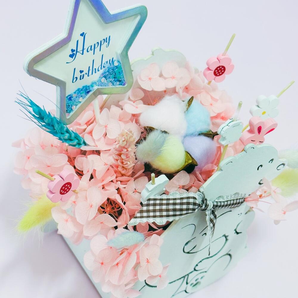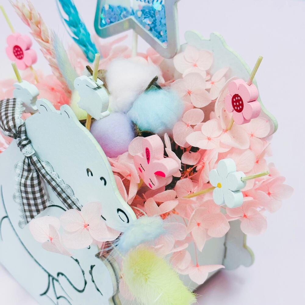 гортензия стабилизированная персиковая – 1 шт.пшеница (сухоцвет) разноцветный – 2 шт.хлопок (сухоцвет) радужный – 1 шт.лагурус (сухоцвет) разноцветный – 5 шт.декор на палочке – 6 шт.кашпо деревянное фигурное мишки – 1 шт.декор с блестками – 1 шт.Упаковка дизайнерская – 1 шт.