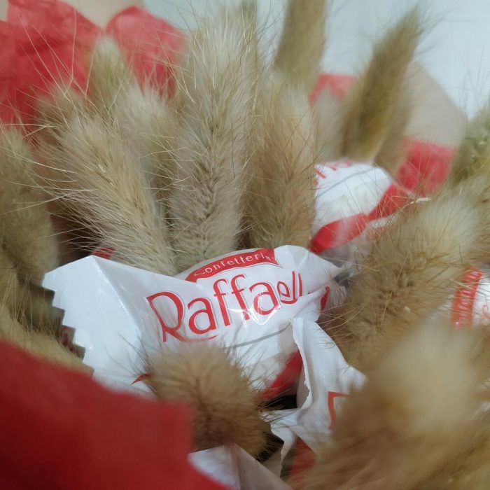 Raffaello конфеты – 19 шт.Лагурус – 50 шт.Тишью – 1 шт.Бумага – 1 шт.Лента – 1 шт.